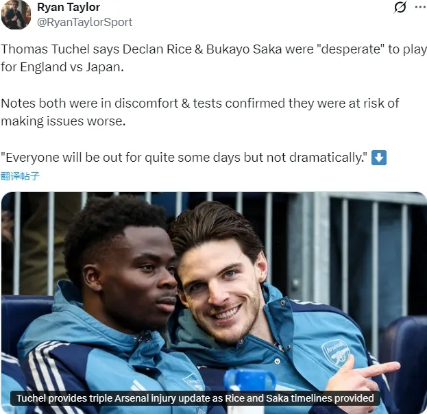 关键就是这句“赖斯和萨卡在接受医疗评估时明显身体不适”,也就是说,两人可能在体测时均表明身体某些部位不舒服,而不是成像技术显示某些部位受伤,换句话说,问题不大。